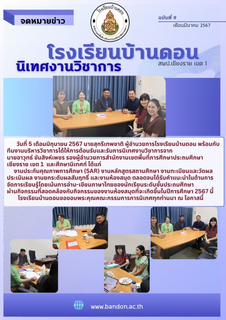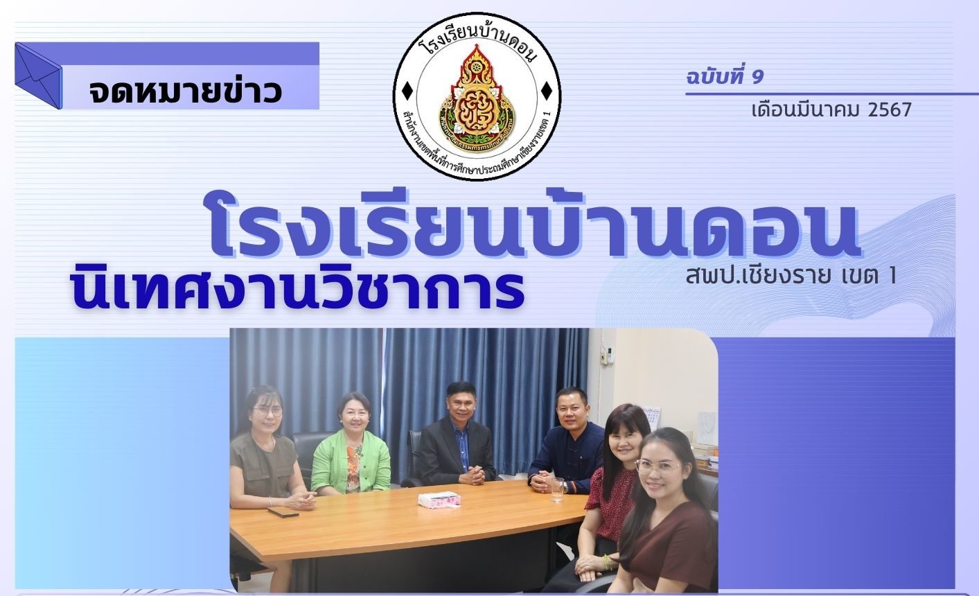 5 เดือนมิถุนายน 2567 นายสุกรี เทพชาติ ผู้อำนวยการโรงเรียนบ้านดอน พร้อมกับทีมงานบริหารวิชาการได้ให้การต้อนรับและรับการนิเทศงานวิชาการจากนายอาวุทธ์ ขันสิงห์เพชร ผู้อำนวยการสำนักงานเขตพื้นที่การศึกษาประถมศึกษาเชียงราย เขต 1 และศึกษานิเทศก์ ได้แก่ งานประกันคุณภาพการศึกษา (SAR) งานหลักสูตรสถานศึกษา งานทะเบียนและวัดผลประเมินผล งานยกระดับผลสัมฤทธิ์ และงานห้องสมุด ตลอดจนได้รับคำแนะนำในด้านการจัดการเรียนรู้โดยเน้นการอ่าน-เขียนภาษาไทยของนักเรียนระดับชั้นประถมศึกษา ผ่านกิจกรรมที่สอดคล้องกับกิจกรรมของงานห้องสมุดที่จะเกิดขึ้นในปีการศึกษา 2567