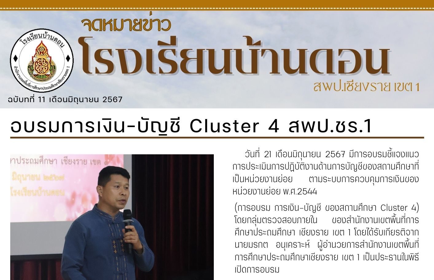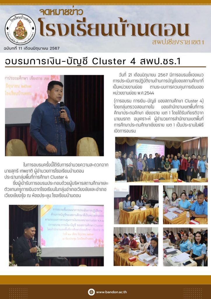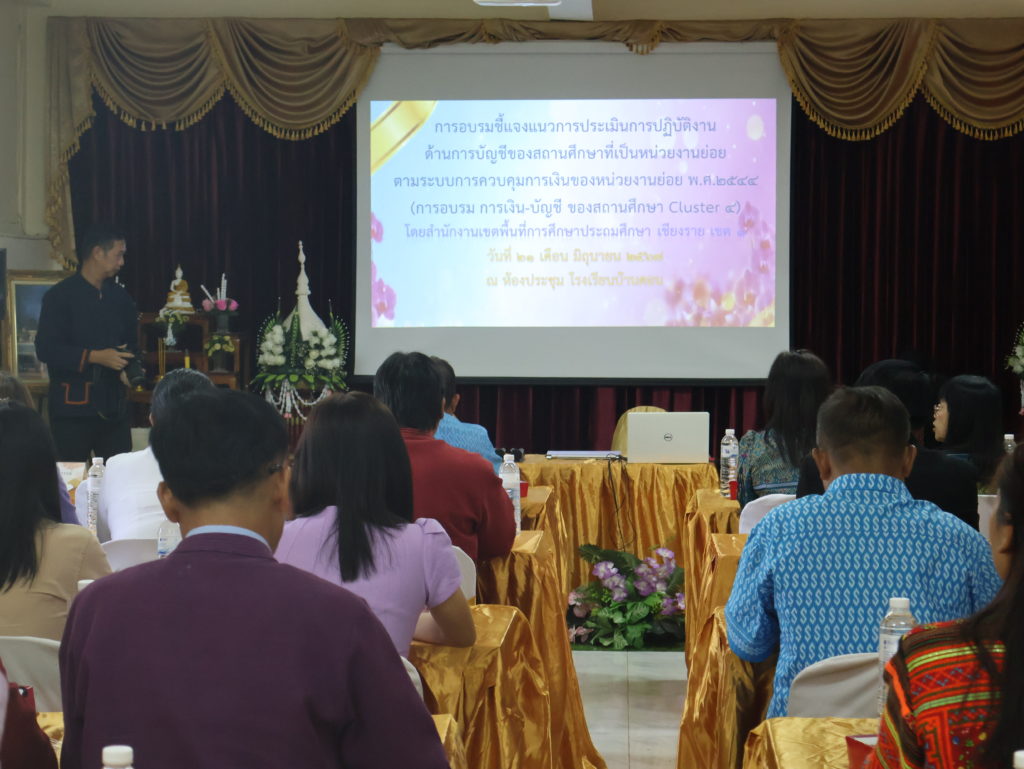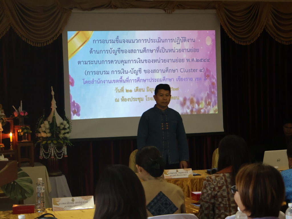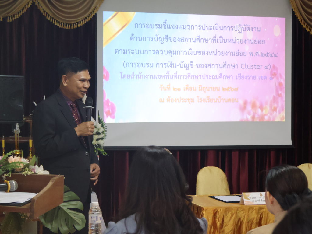 21 เดือนมิถุนายน 2567 นายมรกต อนุเคราะห์ ผู้อำนวยการสำนักงานเขตพื้นที่การศึกษาประถมศึกษาเชียงราย เขต 1เป็นประธานในพิธีเปิดการอบรม เปิดการอบรมชี้แจงแนวการประเมินการปฏิบัติงานด้านการบัญชีของสถานศึกษาที่เป็นหน่วยงานย่อย ตามระบบการควบคุมการเงินของหน่วยงานย่อย พ.ศ.2544 (การอบรม การเงิน-บัญชี ของสถานศึกษา Cluster 4) โดยกลุ่มตรวจสอบภายใน ของสำนักงานเขตพื้นที่การศึกษาประถมศึกษา เชียงราย เขต 1