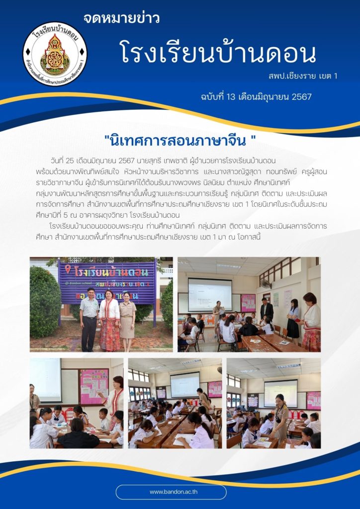 วันที่ 25 เดือนมิถุนายน 2567 นายสุกรี เทพชาติ ผู้อำนวยการโรงเรียนบ้านดอน พร้อมด้วยนางพิณทิพย์สมใจ หัวหน้างานบริหารวิชาการ และนางสาวณัฐสุดา ทอนทรัพย์ ครูผู้สอนรายวิชาภาษาจีน ผู้เข้ารับการนิเทศก์ ได้ต้อนรับนางพวงพร นิลนิยม ตำแหน่ง ศึกษานิเทศก์