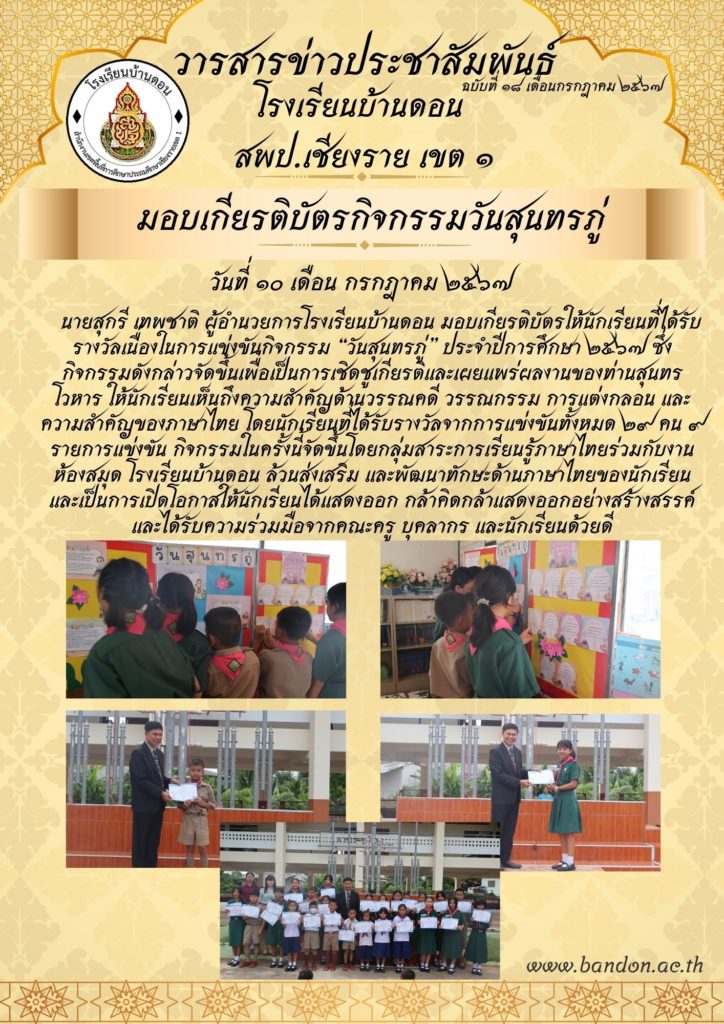 นายสุกรี เทพชาติ ผู้อำนวยการโรงเรียนบ้านดอน มอบเกียรติบัตรให้นักเรียนที่ได้รับรางวัลเนื่องในการแข่งขันกิจกรรม “วันสุนทรภู่” ประจำปีการศึกษา ๒๕๖๗