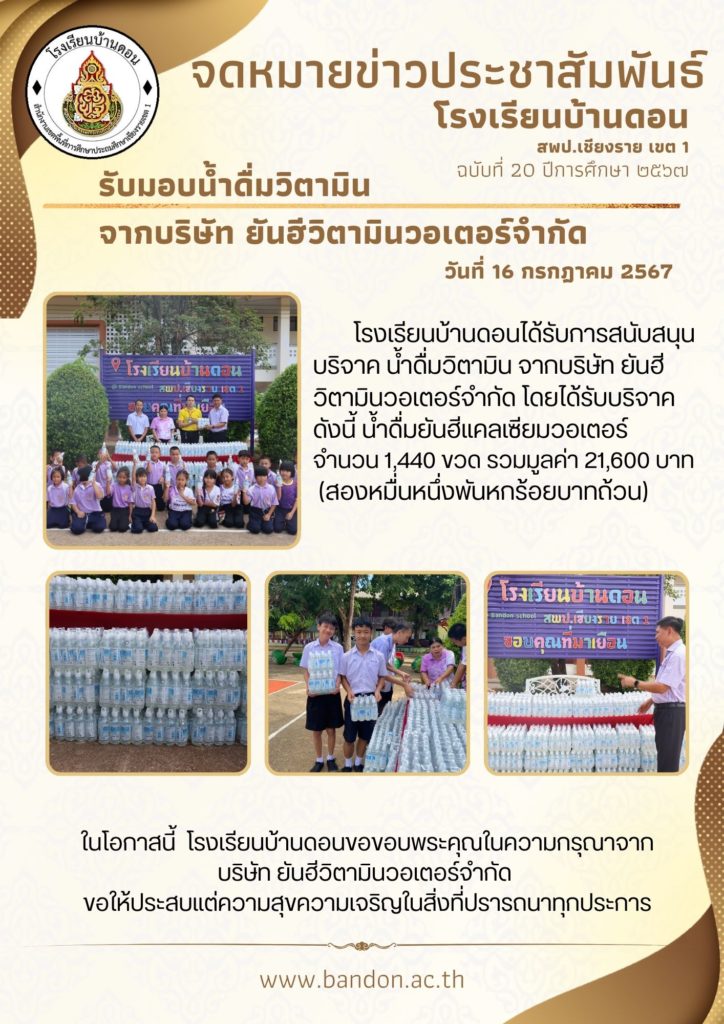 โรงเรียนบ้านดอนได้รับการสนับสนุนบริจาค น้ำดื่มวิตามิน จากบริษัท ยันฮีวิตามินวอเตอร์จำกัด โดยได้รับบริจาคดังนี้ น้ำดื่มยันฮีแคลเซียมวอเตอร์