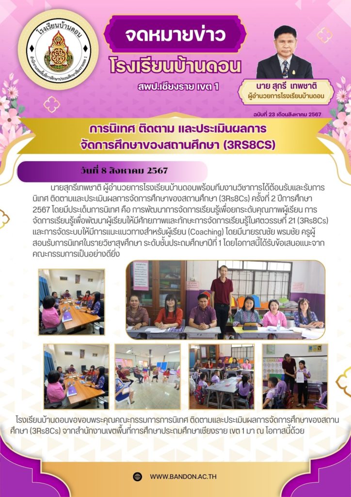 วันที่ 8 สิงหาคม 2567 นายสุกรี เทพชาติ ผู้อำนวยการโรงเรียนบ้านดอนพร้อมทีมงานวิชาการได้ต้อนรับและรับการนิเทศ ติดตามและประเมินผลการจัดการศึกษาของสถานศึกษา (3Rs8Cs) ครั้งที่ 2 ปีการศึกษา 2567